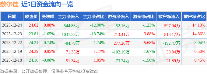12月24日的资金流向数据方面,主力资金净流出544.88万元,占总成交额12.9%,游资资金净流出52.16万元,占总成交额1.23%,散户资金净流入597.04万元,占总成交额14.13%。