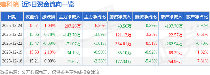 证券之星消息,截至2025年12月24日收盘,建科院(300675)报收于15.51元,上涨1.04%,换手率1.47%,成交量2.16万手,成交额3341.89万元。