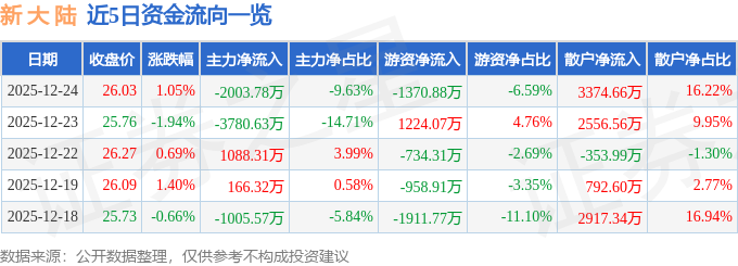 证券之星消息,截至2025年12月24日收盘,新 大 陆(000997)报收于26.03元,上涨1.05%,换手率0.79%,成交量8.0万手,成交额2.08亿元。