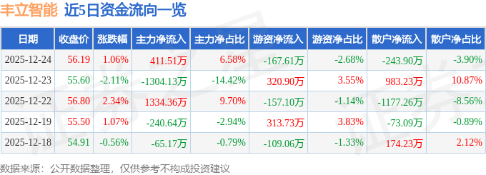 证券之星消息,截至2025年12月24日收盘,丰立智能(301368)报收于56.19元,上涨1.06%,换手率1.74%,成交量1.11万手,成交额6253.76万元。