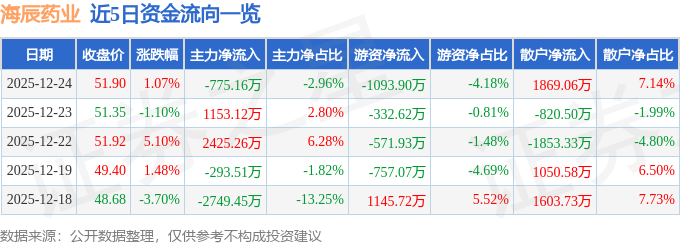 证券之星消息,截至2025年12月24日收盘,海辰药业(300584)报收于51.9元,上涨1.07%,换手率6.14%,成交量5.04万手,成交额2.62亿元。