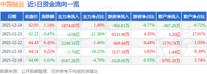 证券之星消息,截至2025年12月24日收盘,中国铀业(001280)报收于62.93元,上涨1.14%,换手率12.71%,成交量20.1万手,成交额12.58亿元。