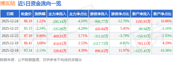 证券之星消息,截至2025年12月24日收盘,博实结(301608)报收于86.19元,上涨1.22%,换手率2.05%,成交量8206.0手,成交额7091.53万元。