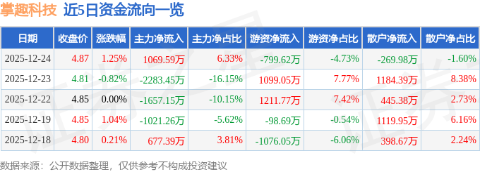 证券之星消息,截至2025年12月24日收盘,掌趣科技(300315)报收于4.87元,上涨1.25%,换手率1.35%,成交量34.89万手,成交额1.69亿元。