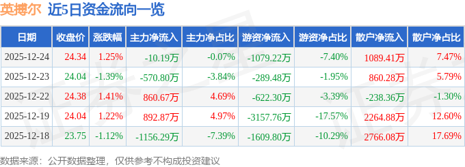 证券之星消息,截至2025年12月24日收盘,英搏尔(300681)报收于24.34元,上涨1.25%,换手率2.82%,成交量6.01万手,成交额1.46亿元。