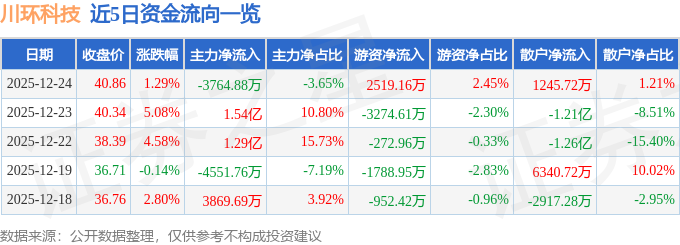 证券之星消息,截至2025年12月24日收盘,川环科技(300547)报收于40.86元,上涨1.29%,换手率14.25%,成交量25.4万手,成交额10.3亿元。