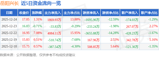 证券之星消息,截至2025年12月24日收盘,岳阳兴长(000819)报收于17.05元,上涨1.31%,换手率2.17%,成交量7.94万手,成交额1.35亿元。