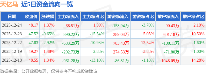 证券之星消息,截至2025年12月24日收盘,天亿马(301178)报收于48.17元,上涨1.37%,换手率1.8%,成交量8929.0手,成交额4298.43万元。
