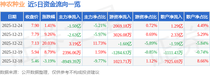 证券之星消息,截至2025年12月24日收盘,神农种业(300189)报收于7.9元,上涨1.41%,换手率41.35%,成交量366.47万手,成交额28.78亿元。