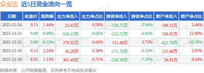 证券之星消息,截至2025年12月24日收盘,众业达(002441)报收于9.13元,上涨1.44%,换手率1.22%,成交量4.88万手,成交额4447.74万元。