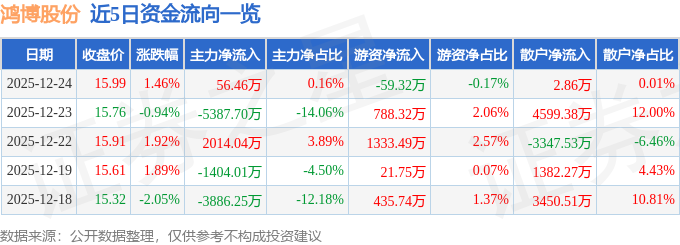 证券之星消息,截至2025年12月24日收盘,鸿博股份(002229)报收于15.99元,上涨1.46%,换手率4.53%,成交量22.33万手,成交额3.57亿元。