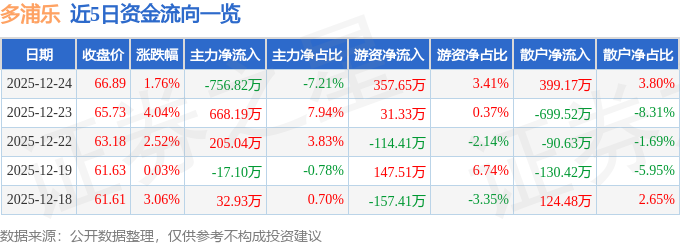 证券之星消息,截至2025年12月24日收盘,多浦乐(301528)报收于66.89元,上涨1.76%,换手率4.91%,成交量1.56万手,成交额1.05亿元。
