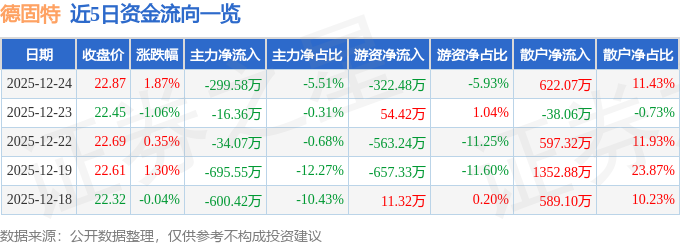 证券之星消息,截至2025年12月24日收盘,德固特(300950)报收于22.87元,上涨1.87%,换手率2.65%,成交量2.39万手,成交额5441.64万元。