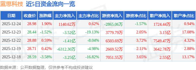 证券之星消息,截至2025年12月24日收盘,蓝思科技(300433)报收于28.98元,上涨1.9%,换手率1.28%,成交量63.42万手,成交额18.3亿元。