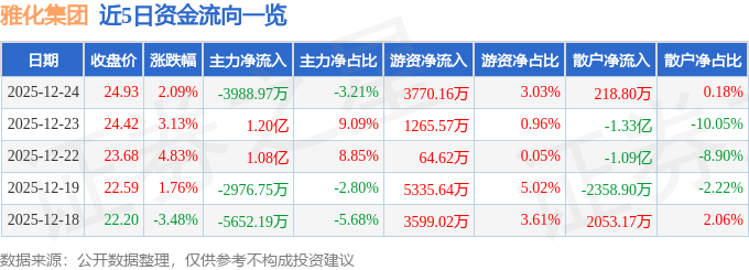 证券之星消息,截至2025年12月24日收盘,雅化集团(002497)报收于24.93元,上涨2.09%,换手率4.76%,成交量50.35万手,成交额12.44亿元。