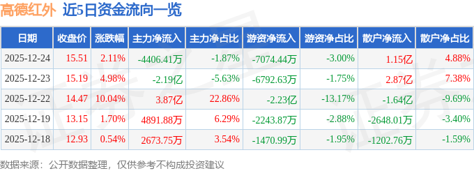 证券之星消息,截至2025年12月24日收盘,高德红外(002414)报收于15.51元,上涨2.11%,换手率4.5%,成交量152.81万手,成交额23.55亿元。