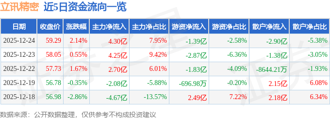 证券之星消息,截至2025年12月24日收盘,立讯精密(002475)报收于59.29元,上涨2.14%,换手率1.26%,成交量91.86万手,成交额54.04亿元。