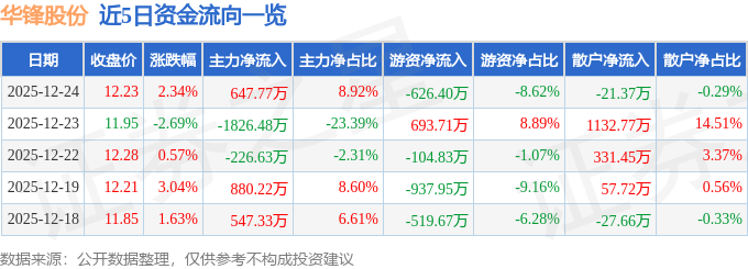 证券之星消息,截至2025年12月24日收盘,华锋股份(002806)报收于12.23元,上涨2.34%,换手率3.43%,成交量5.97万手,成交额7264.45万元。