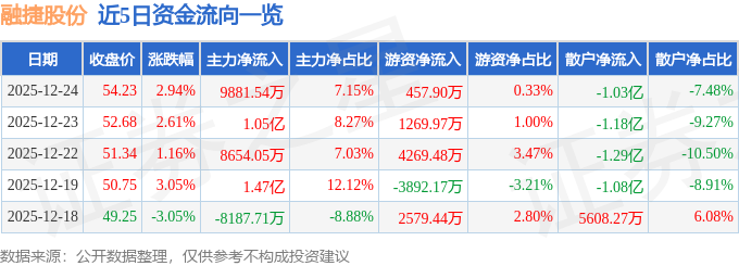 证券之星消息,截至2025年12月24日收盘,融捷股份(002192)报收于54.23元,上涨2.94%,换手率9.9%,成交量25.65万手,成交额13.82亿元。