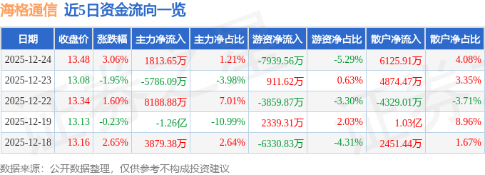 证券之星消息,截至2025年12月24日收盘,海格通信(002465)报收于13.48元,上涨3.06%,换手率4.54%,成交量112.49万手,成交额15.01亿元。