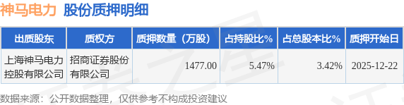 证券之星消息,神马电力(603530)12月25日公开信息显示,股东上海神马电力控股有限公司向招商证券股份有限公司合计质押1477.0万股,占总股本3.42%。质押详情见下表: