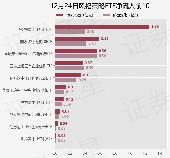 当日有14只风格策略ETF基金出现资金净流入,其中净流入排首位的是华泰柏瑞上证红利ETF(510880),份额增加了4000.0万份,净流入额为1.26亿元。