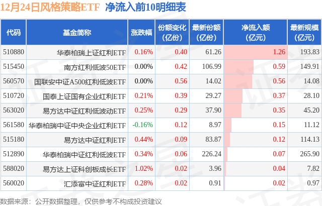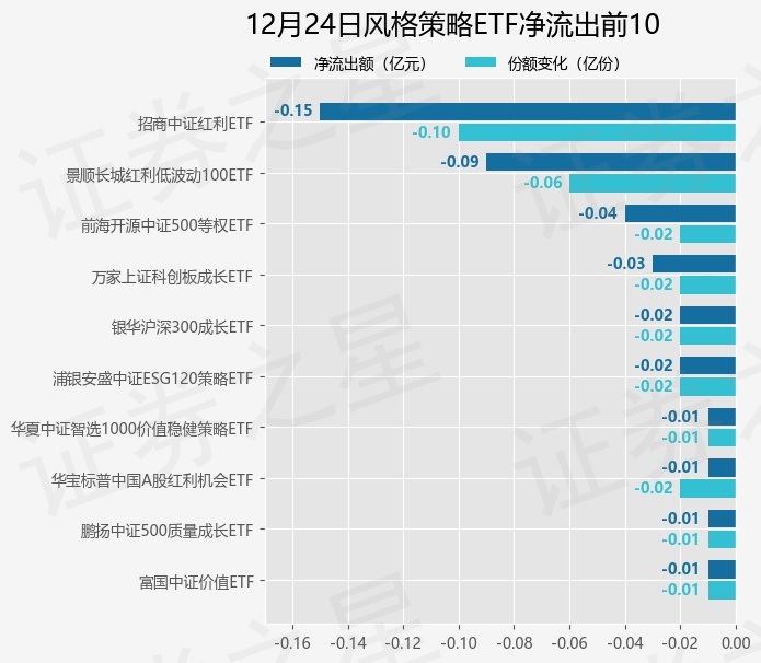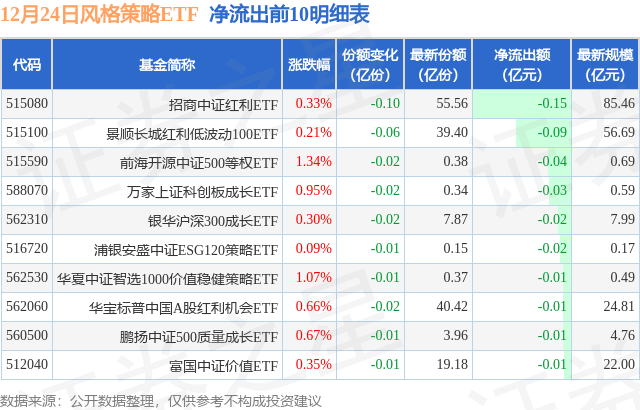 当日有12只风格策略ETF基金出现资金净流出,其中净流出排首位的是招商中证红利ETF(515080),份额减少了1000.0万份,净流出额为1534.45万元。
