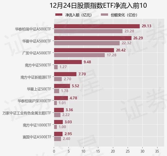 当日有110只股票指数ETF基金出现资金净流入,其中净流入排首位的是华泰柏瑞中证A500ETF(563360),份额增加了23.28亿份,净流入额为29.13亿元。