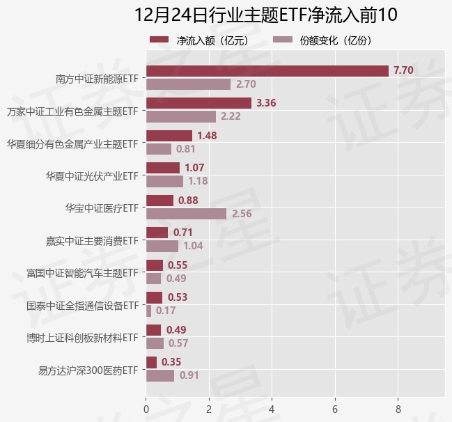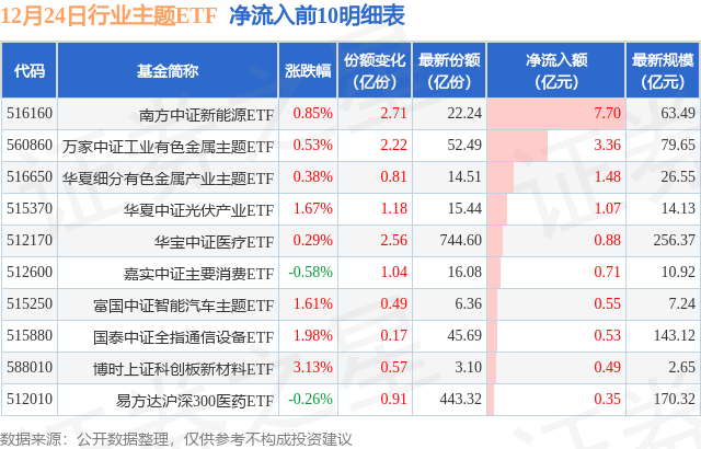 当日有41只行业主题ETF基金出现资金净流入,其中净流入排首位的是南方中证新能源ETF(516160),份额增加了2.71亿份,净流入额为7.7亿元。