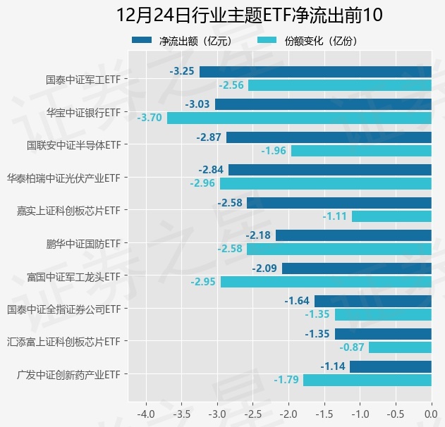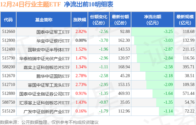 当日有175只行业主题ETF基金出现资金净流出,其中净流出排首位的是国泰中证军工ETF(512660),份额减少了2.56亿份,净流出额为3.25亿元。