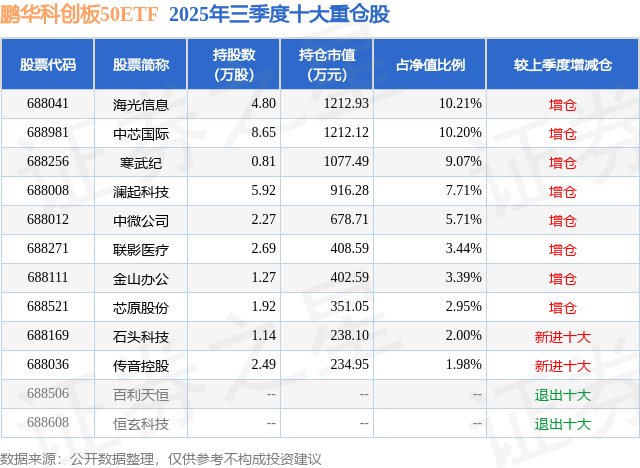 鹏华科创板50ETF基金成立于2025年4月3日,基金经理为张羽翔,基金跟踪标的为上证科创板50成份指数,成立以来超额回报为6.29%,近一个月超额回报为0.14%。最新披露的基金持仓数据显示,截止2025年9月30日,该基金第一大重仓股为海光信息(688041),持股占比为10.21%。