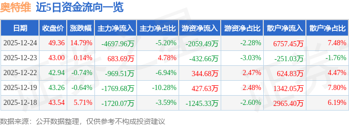 证券之星消息,截至2025年12月24日收盘,奥特维(688516)报收于49.36元,上涨14.79%,换手率6.1%,成交量19.2万手,成交额9.03亿元。