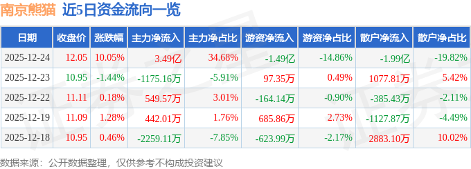 证券之星消息,截至2025年12月24日收盘,南京熊猫(600775)报收于12.05元,上涨10.05%,涨停,换手率12.78%,成交量85.88万手,成交额10.05亿元。