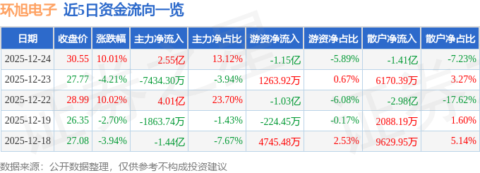 证券之星消息,截至2025年12月24日收盘,环旭电子(601231)报收于30.55元,上涨10.01%,涨停,换手率3.0%,成交量66.45万手,成交额19.45亿元。