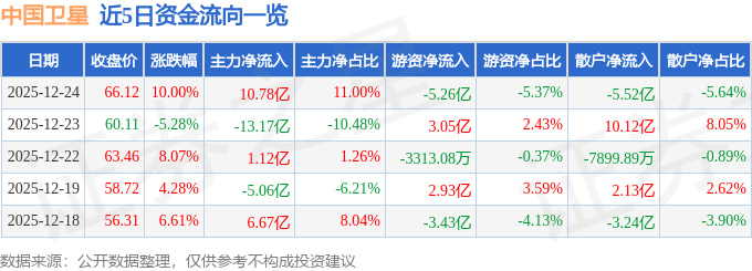 证券之星消息,截至2025年12月24日收盘,中国卫星(600118)报收于66.12元,上涨10.0%,涨停,换手率13.11%,成交量155.04万手,成交额97.93亿元。