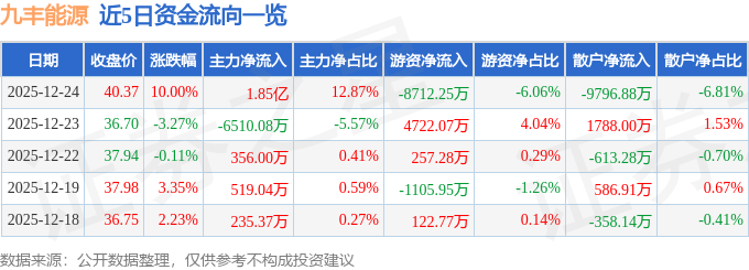 证券之星消息,截至2025年12月24日收盘,九丰能源(605090)报收于40.37元,上涨10.0%,涨停,换手率5.28%,成交量36.64万手,成交额14.39亿元。
