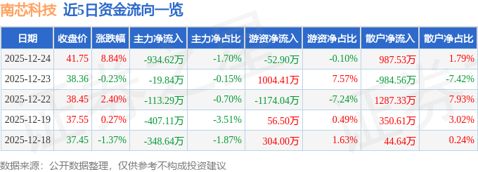 证券之星消息,截至2025年12月24日收盘,南芯科技(688484)报收于41.75元,上涨8.84%,换手率4.54%,成交量13.4万手,成交额5.51亿元。
