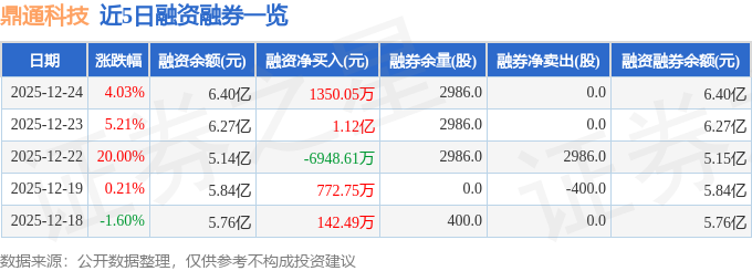 鼎通科技融资融券信息显示,融资方面,当日融资买入1.89亿元,融资偿还1.76亿元,融资净买入1350.05万元。融券方面,融券卖出0.0股,融券偿还0.0股,融券余量2986.0股,融券余额38.86万元。融资融券余额6.4亿元。