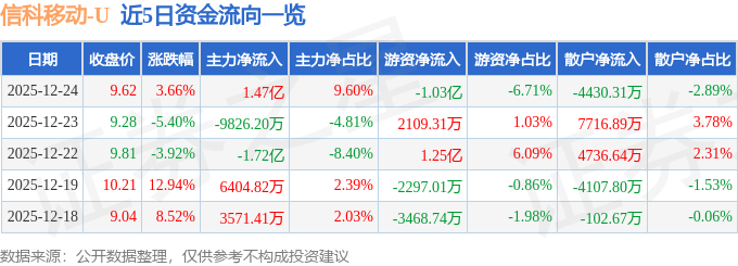 证券之星消息,截至2025年12月24日收盘,信科移动(688387)报收于9.62元,上涨3.66%,换手率8.01%,成交量161.57万手,成交额15.32亿元。