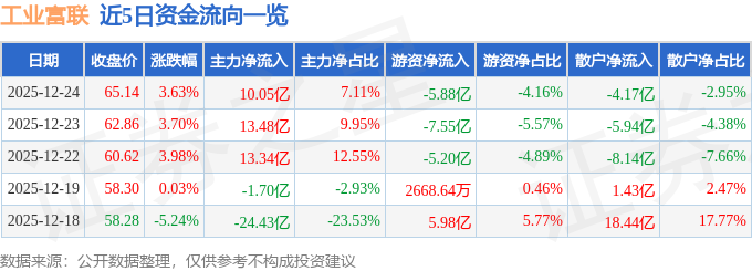 证券之星消息,截至2025年12月24日收盘,工业富联(601138)报收于65.14元,上涨3.63%,换手率1.1%,成交量217.87万手,成交额141.25亿元。