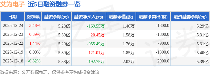 艾为电子融资融券信息显示,融资方面,当日融资买入3247.04万元,融资偿还3416.59万元,融资净偿还169.55万元。融券方面,融券卖出0.0股,融券偿还1800.0股,融券余量1.4万股,融券余额105.47万元。融资融券余额5.29亿元。