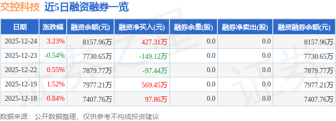 交控科技融资融券信息显示,融资方面,当日融资买入888.81万元,融资偿还461.5万元,融资净买入427.31万元。融券方面,融券卖出0.0股,融券偿还0.0股,融券余量0.0股,融券余额0.0万元。融资融券余额8157.96万元。