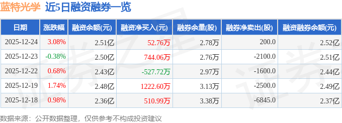 蓝特光学融资融券信息显示,融资方面,当日融资买入2466.71万元,融资偿还2413.95万元,融资净买入52.76万元。融券方面,融券卖出400.0股,融券偿还200.0股,融券余量2.78万股,融券余额105.92万元。融资融券余额2.52亿元。