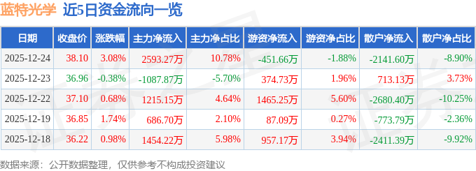 证券之星消息,截至2025年12月24日收盘,蓝特光学(688127)报收于38.1元,上涨3.08%,换手率1.57%,成交量6.39万手,成交额2.41亿元。