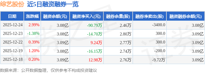 综艺股份融资融券信息显示,融资方面,当日融资买入857.77万元,融资偿还948.56万元,融资净偿还90.79万元。融券方面,融券卖出0.0股,融券偿还3400.0股,融券余量2.46万股,融券余额12.72万元。融资融券余额3.08亿元。