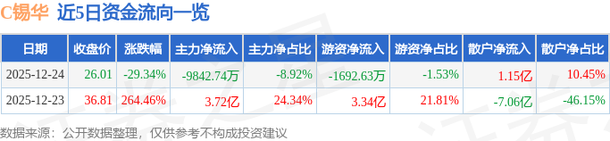 证券之星消息,截至2025年12月24日收盘,C锡华(603248)报收于26.01元,下跌29.34%,换手率57.63%,成交量39.94万手,成交额11.04亿元。