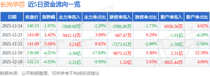 证券之星消息,截至2025年12月24日收盘,长光华芯(688048)报收于140.19元,下跌1.97%,换手率6.98%,成交量12.3万手,成交额17.26亿元。