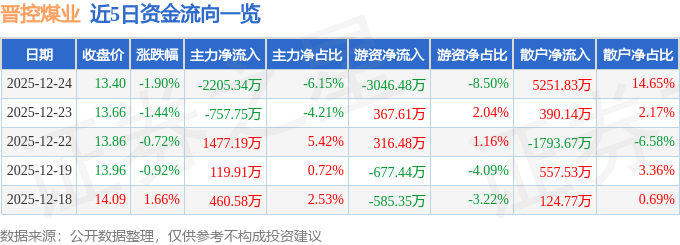 证券之星消息,截至2025年12月24日收盘,晋控煤业(601001)报收于13.4元,下跌1.9%,换手率1.61%,成交量26.97万手,成交额3.59亿元。