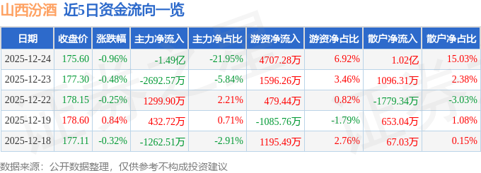 证券之星消息,截至2025年12月24日收盘,山西汾酒(600809)报收于175.6元,下跌0.96%,换手率0.32%,成交量3.87万手,成交额6.81亿元。