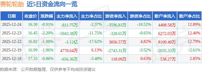 证券之星消息,截至2025年12月24日收盘,赛轮轮胎(601058)报收于16.3元,下跌0.91%,换手率0.64%,成交量20.99万手,成交额3.42亿元。